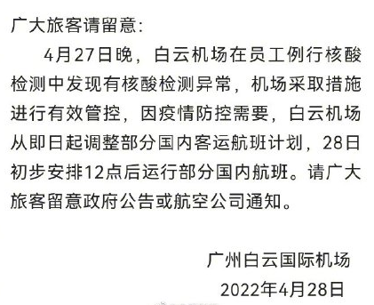 今早,廣州白云機(jī)場(chǎng)發(fā)布公告“4月27日晚,白云機(jī)場(chǎng)在員工例行核酸檢測(cè)中發(fā)現(xiàn)有核酸檢測(cè)異常,機(jī)場(chǎng)采取措施進(jìn)行有效管控。因疫情需要,白云機(jī)場(chǎng)從即日起調(diào)整部分國(guó)內(nèi)客運(yùn)航班計(jì)劃,28日初步安排12點(diǎn)后運(yùn)行部分國(guó)內(nèi)航班。請(qǐng)廣大旅客留意政府公告或航空公司通知。”